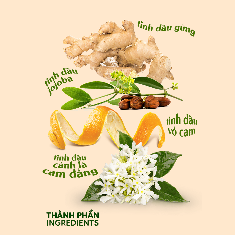 Thành phần: tinh dầu gừng (Zingiber Officinale), tinh dầu vỏ cam chưng cất (Citrus Sinensis), tinh dầu cành lá cam đắng (Citrus Bigaradia), dầu jojoba oil (Simmondsia Chinensis).