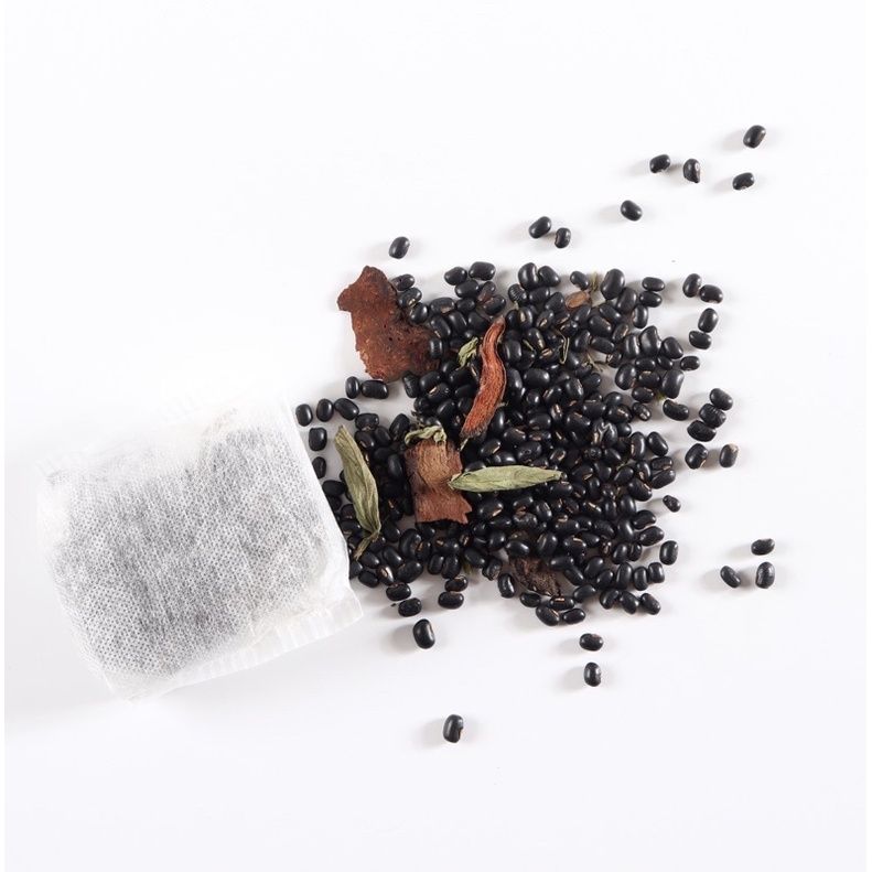 - Cho túi lọc 50g (Đã được định lượng chia sẳn) hoặc nữa chén ăn cơm đậu rang cùng 3-4 lá cỏ ngọt với 2-3 lát hà thủ ô cho vào 2-3 lít nước sôi. Hoặc nấu sôi trực tiếp trên bếp 3’ thì tắt bếp
