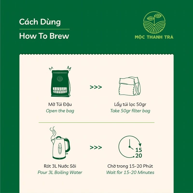 - Cho túi lọc 50g (Đã được định lượng chia sẳn) hoặc nữa chén ăn cơm đậu rang cùng 2-3 lá cỏ ngọt với 3-4 lát hà thủ ô cho vào 2-3 lít nước sôi. Hoặc nấu sôi trực tiếp trên bếp 3’ thì tắt bếp