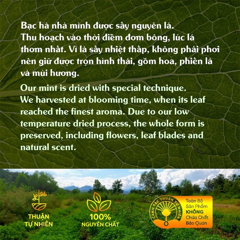 Bạc hà nhà mình được sấy nguyên lá. Thu hoạch vào thời điểm đơm bông, lúc lá thơm nhất. Vì lá sấy nhiệt thấp, không phải phơi nên giữ được trọn vẹn hình thái, gồm hoa, phiến lá và mùi hương